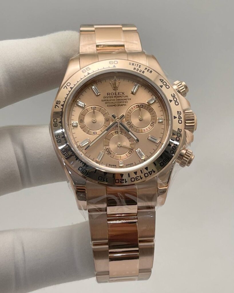 Rolex Daytona Pink Dial Baguette Diamonds Numerals Full Rose Gold