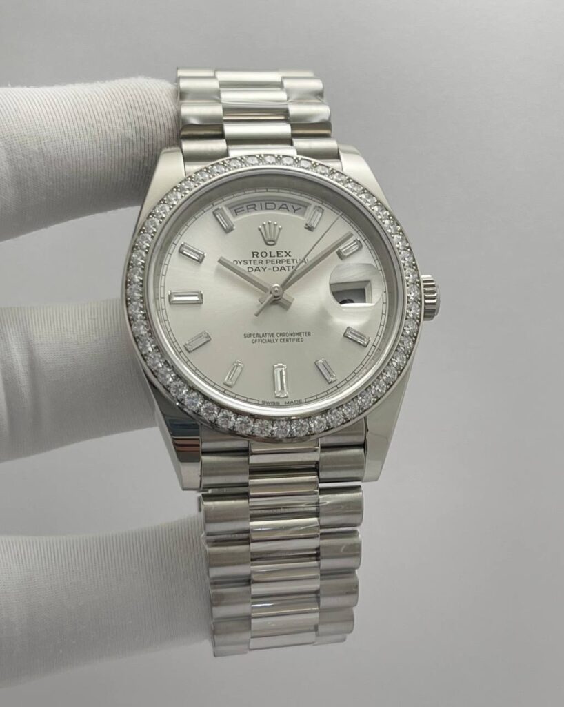 Rolex Daydate Factory Baguette Diamonds Numerals Silver Dial