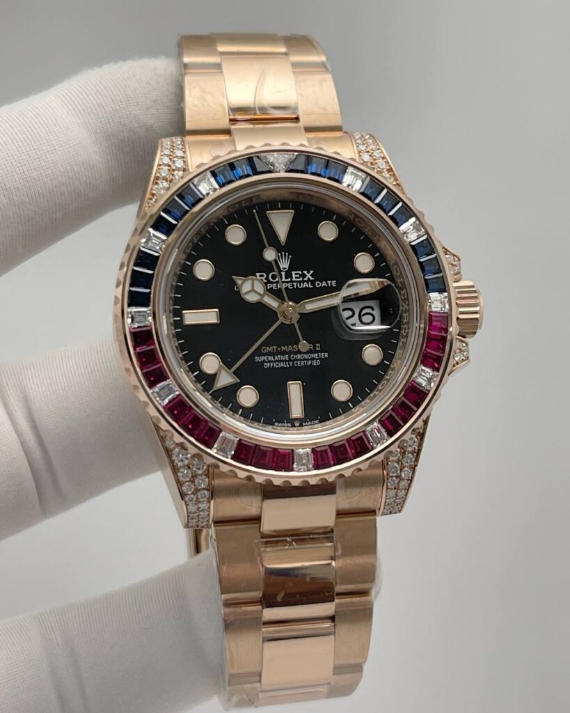 Rolex GMT Master II 126755SARU Rose Gold Blue & Red Gems
