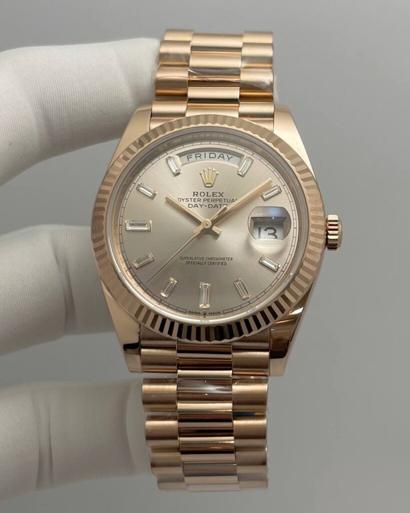 Rolex Daydate II Baguette Diamond Sundust Dial Rose Gold